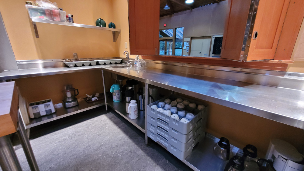 The Main Room has lovely high ceilings, with access to the outside or tent area via a large glass power door. A well equipped commercial kitchen is connected by a pass through window. See Rentals for more pictures.