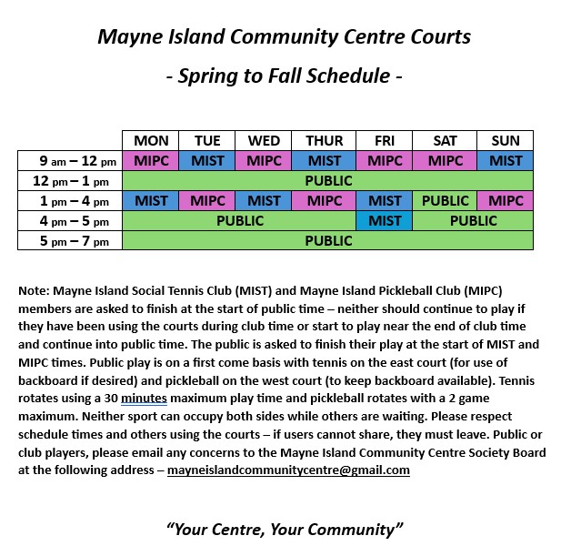 - For more information about the Mayne Island Pickleball Club, please email pickleballonmayne@gmail.com; Follow on Facebook
